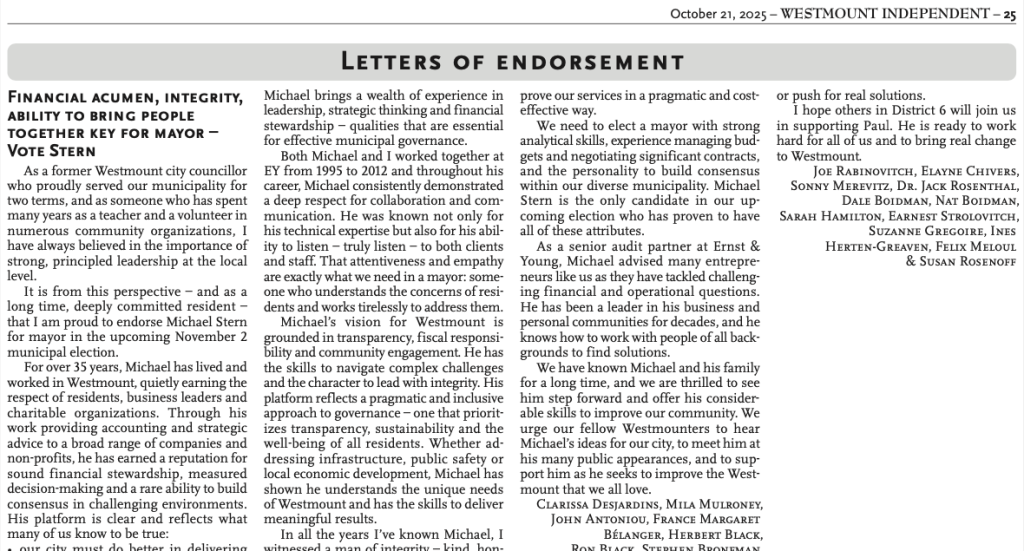 Trois candidats se sont lancés dans la course pour devenir le prochain maire de Westmount : la conseillère Mary Gallery, l’avocate Lynne Casgrain et le comptable Michael Stern.